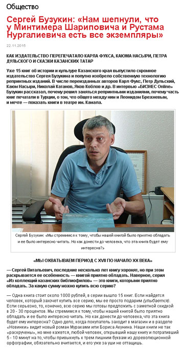 К нам в гости приходил корреспондент деловой электронной газеты Татарстана «БИЗНЕС Online» Лиля Ахкиямова. Мы решили разместить в новостях издательства ссылку на интервью, опубликованное на сайте газеты 22 ноября под заголовком "Сергей Бузукин: «Нам шепнули, что у Минтимера Шариповича и Рустама Нургалиевича есть все экземпляры»" в рубрике "Общество".