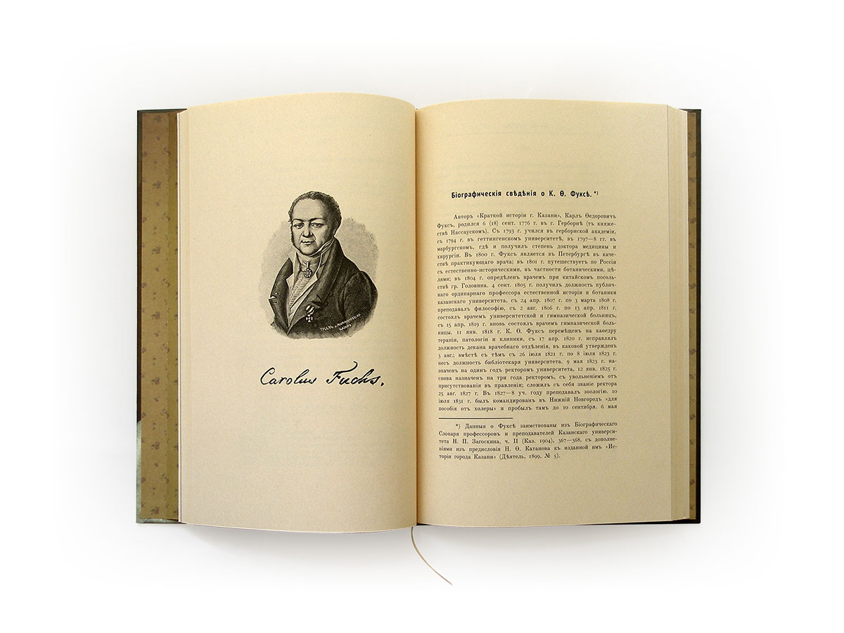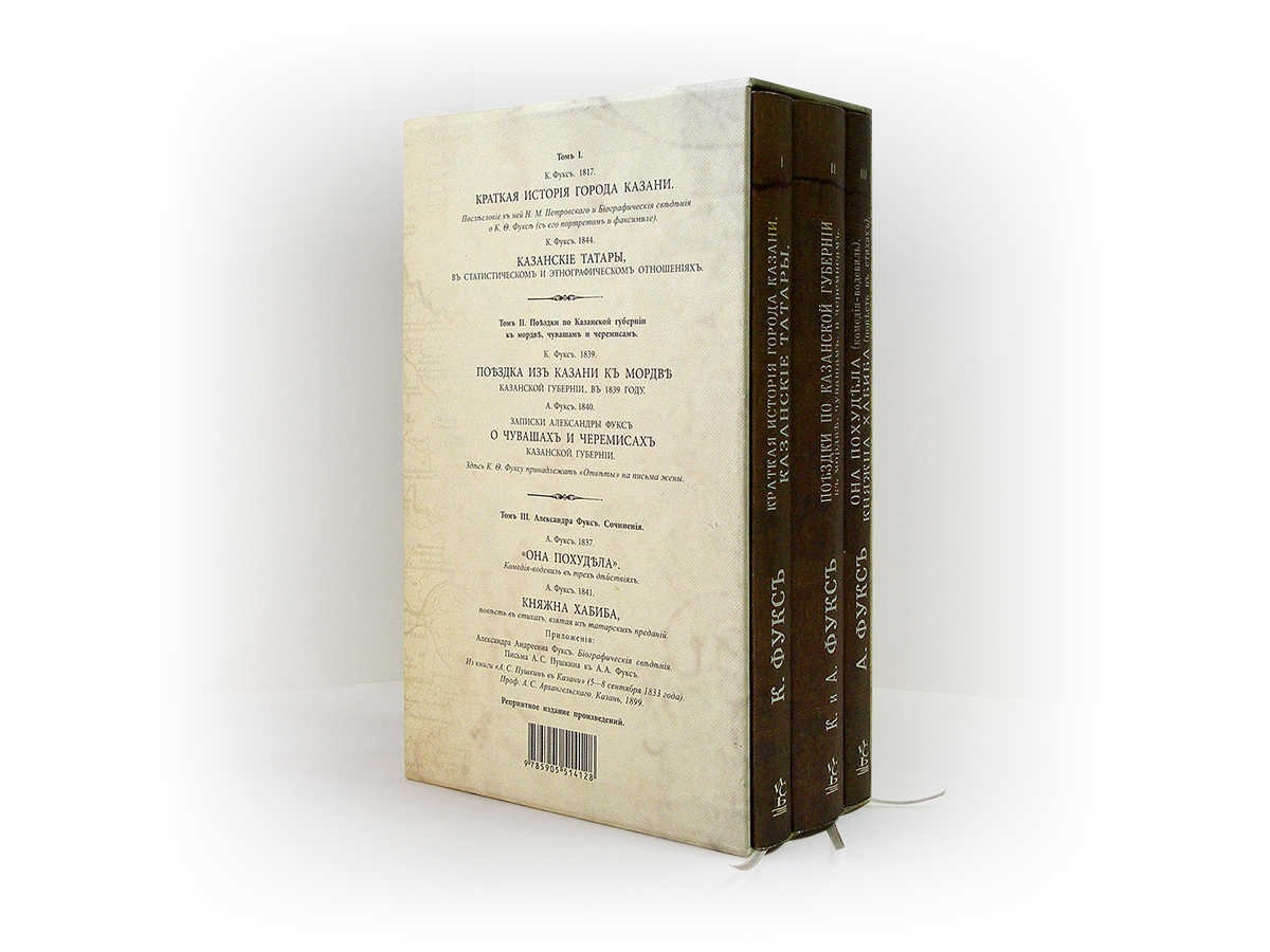 Репринтное издание в трех томах посвящено истории Казани, Казанского края и народов, его населяющих. Авторы произведений трехтомника — известный казанский врач, историк и этнограф К. Ф. Фукс и его жена А. А. Фукс, урожденная Апехтина.